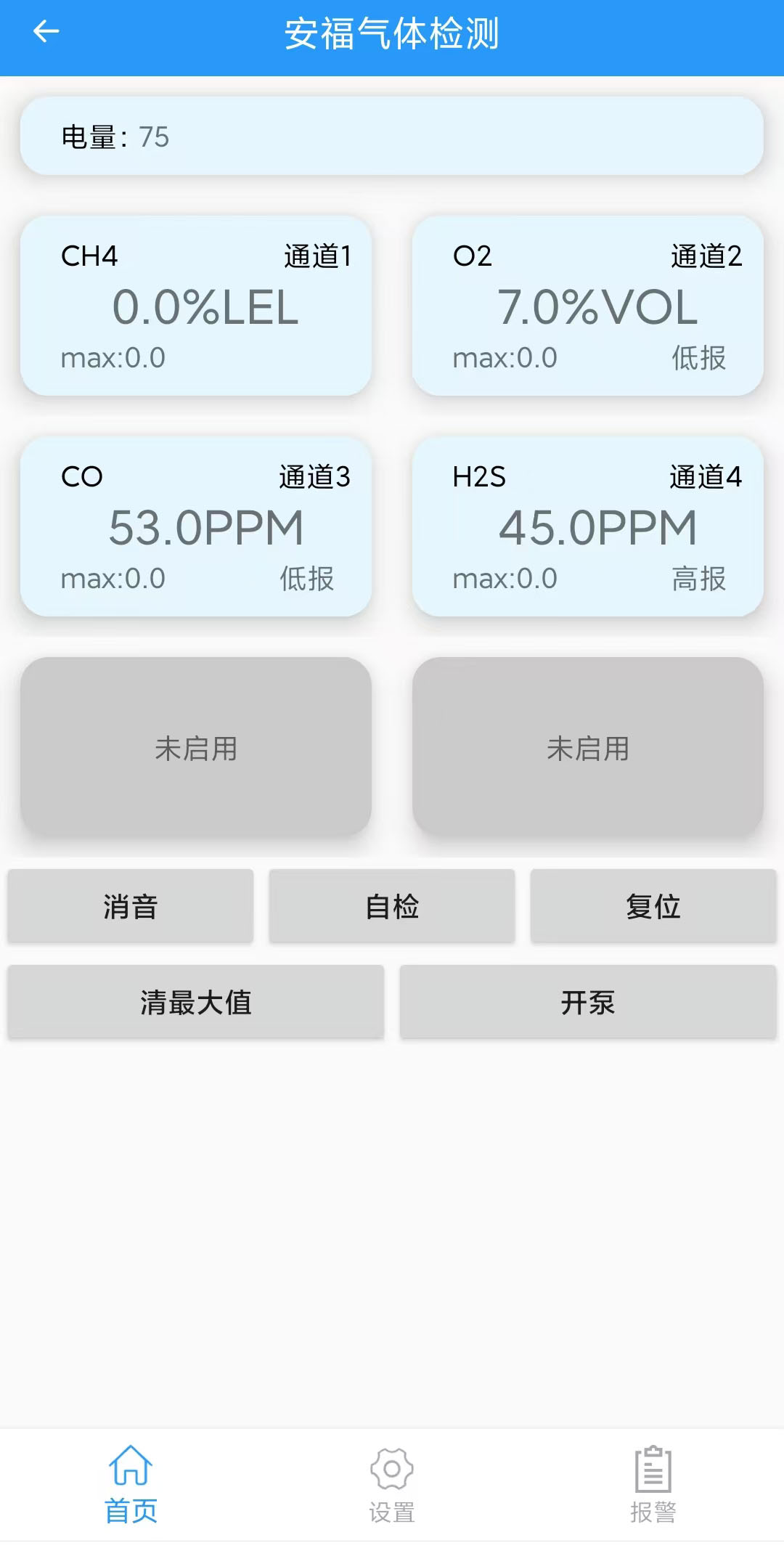低报、高报两级报警均可设置,屏幕显示报警类别